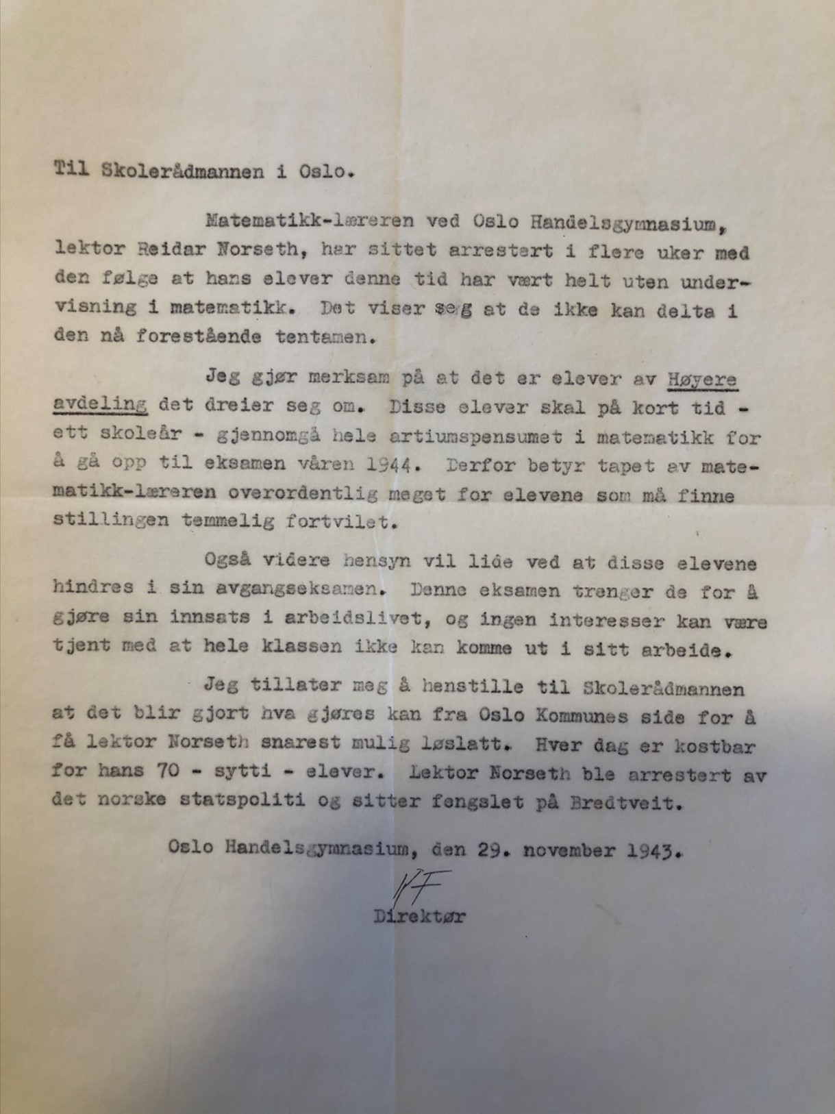 Brev fra Kåre Foss til skolerådmannen i Oslo, 1943