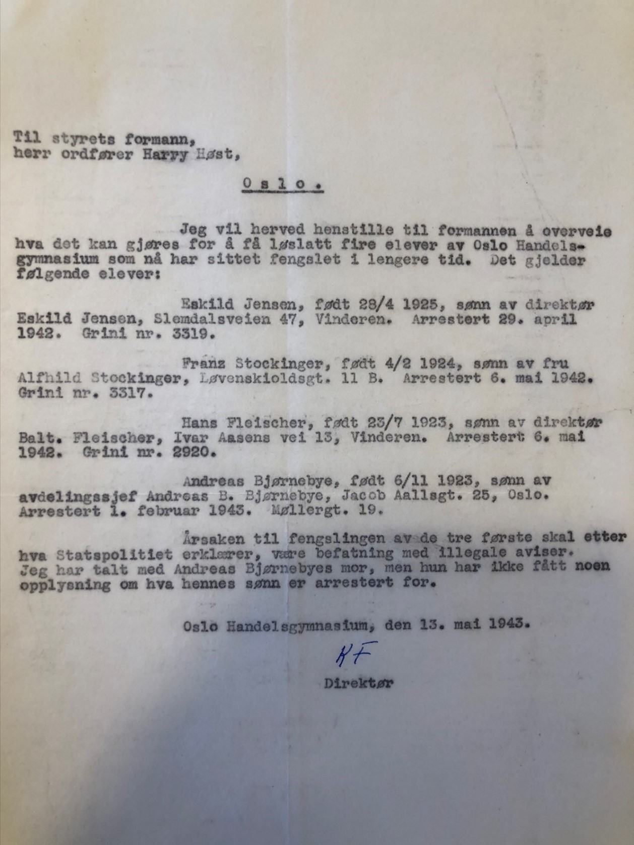 Brev fra Kåre Foss til styreformann Harry Høst, 1943