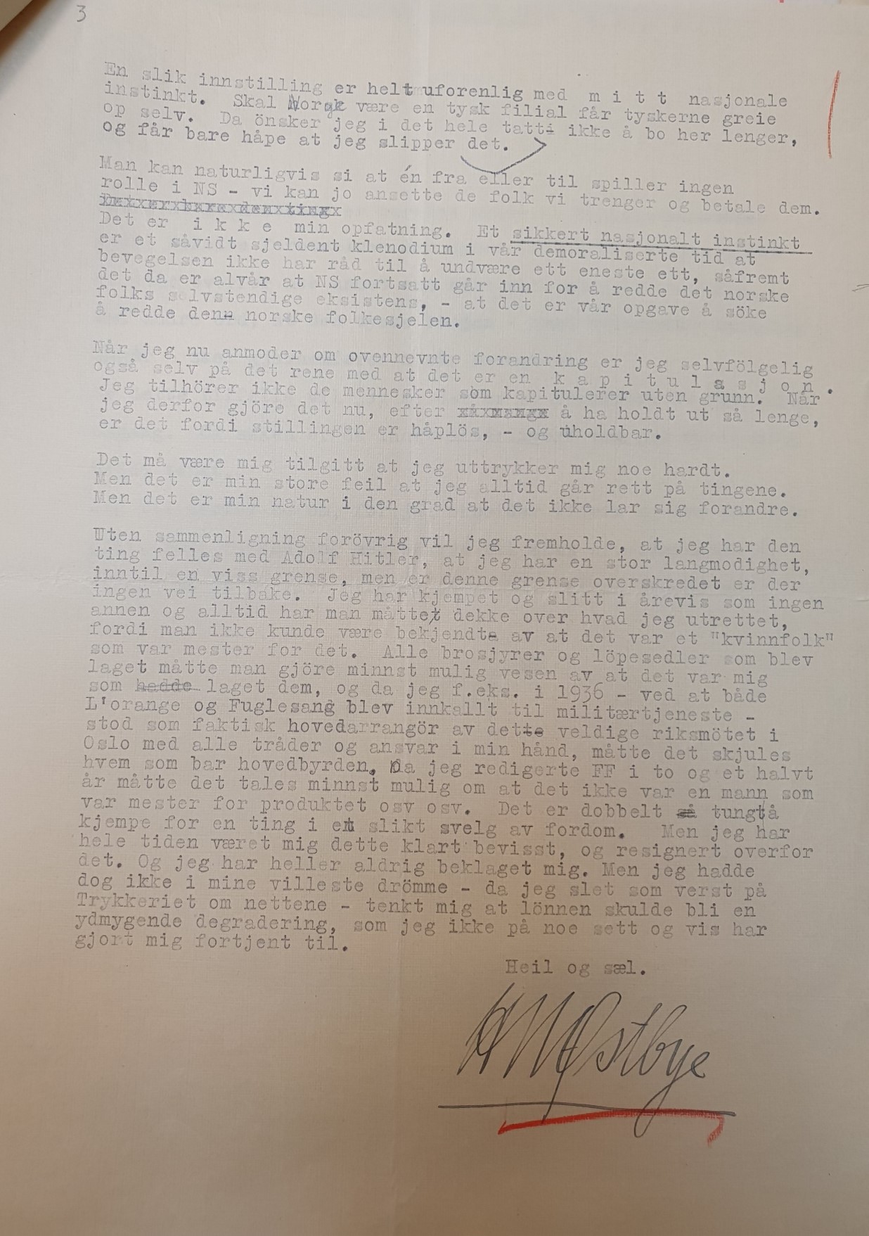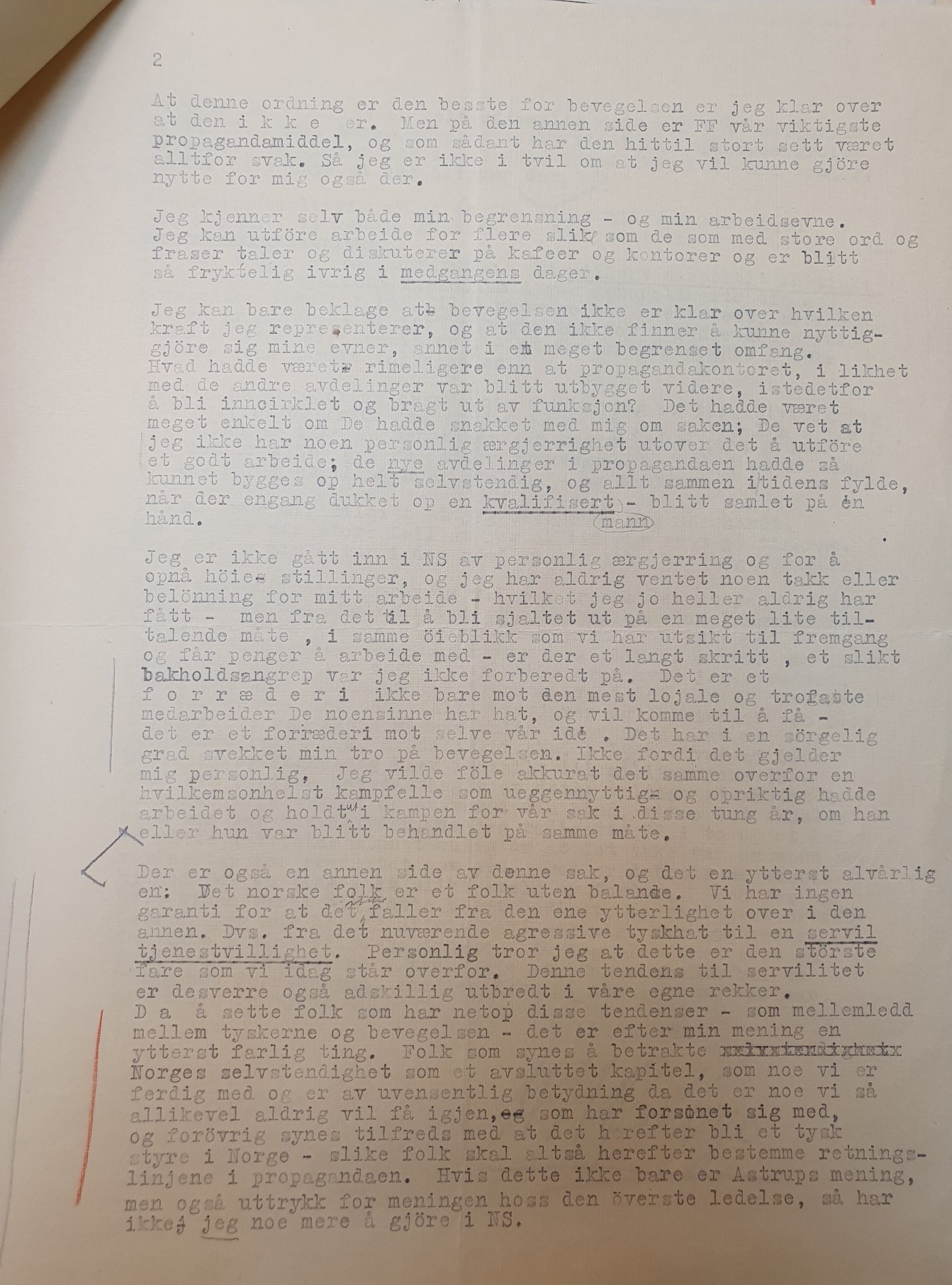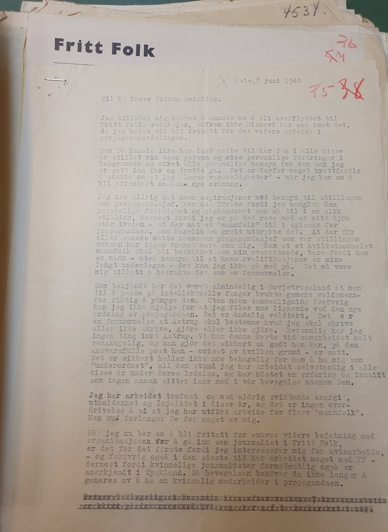 I dette brevet fra 1940 retter Halldis Neegaard Østbye kraftig kritikk mot føreren Vidkun Quisling fordi hun føler seg tilsidesatt av mannlige partimedlemmer. Brevet er hentet fra landssviksaken til Østbye i Riksarkivet, og tall og understrekinger i kilden har sammenheng med dette. (Kilde: Landssvikarkivet i Riksarkivet)